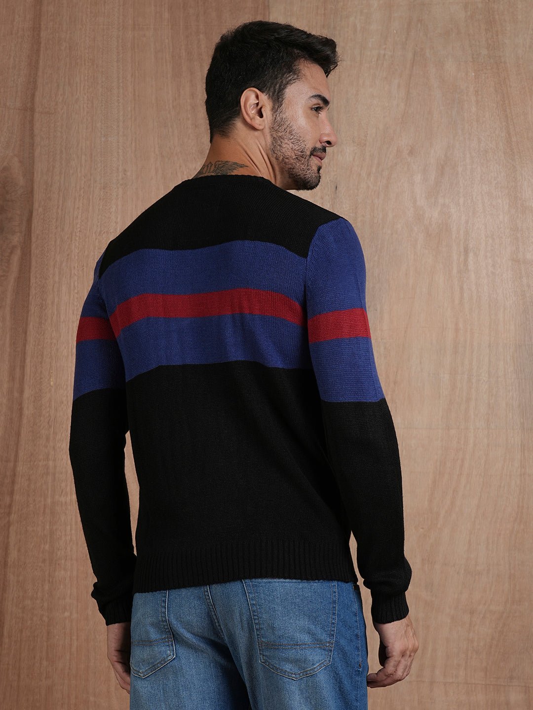 Product Description Soft acrylic fabric for all-day comfort Durable and easy to care for, ideal for daily wear Trendy design to complement any winter outfit Premium acrylic fabric for a soft, durable, and easy-to-maintain finish Material: Acrylic Size: Model is wearing L size Country of Origin: Proudly Indian Fit: Regular fit with ribbed cuffs and hem for added comfort and style. Design: Black color with strip base featuring modern trendy look. Perfect for casual hangouts, workdays, or an evening out—dress Why Choose This PulloverPerfect for layering over shirts or pairing with jeans for a casual yet refined outfit. Its minimalistic design with a hint of detail on the sleeve makes it suitable for work, outings, or lounging in style. Add this versatile pullover to your wardrobe today and experience unmatched comfort and elegance Washing Instructions: Machine wash. Do not iron directly . Dry on flat surface as hanging may cause measurement variations. Product Description Buy Mens Pullover in multiple color from Pronk online with free worldwide shipping. Choose from a wide range of Pullover for Mens Available in S,M,L,XL Shop now ! Color shown in the picture may vary from the actual product due to different lighting