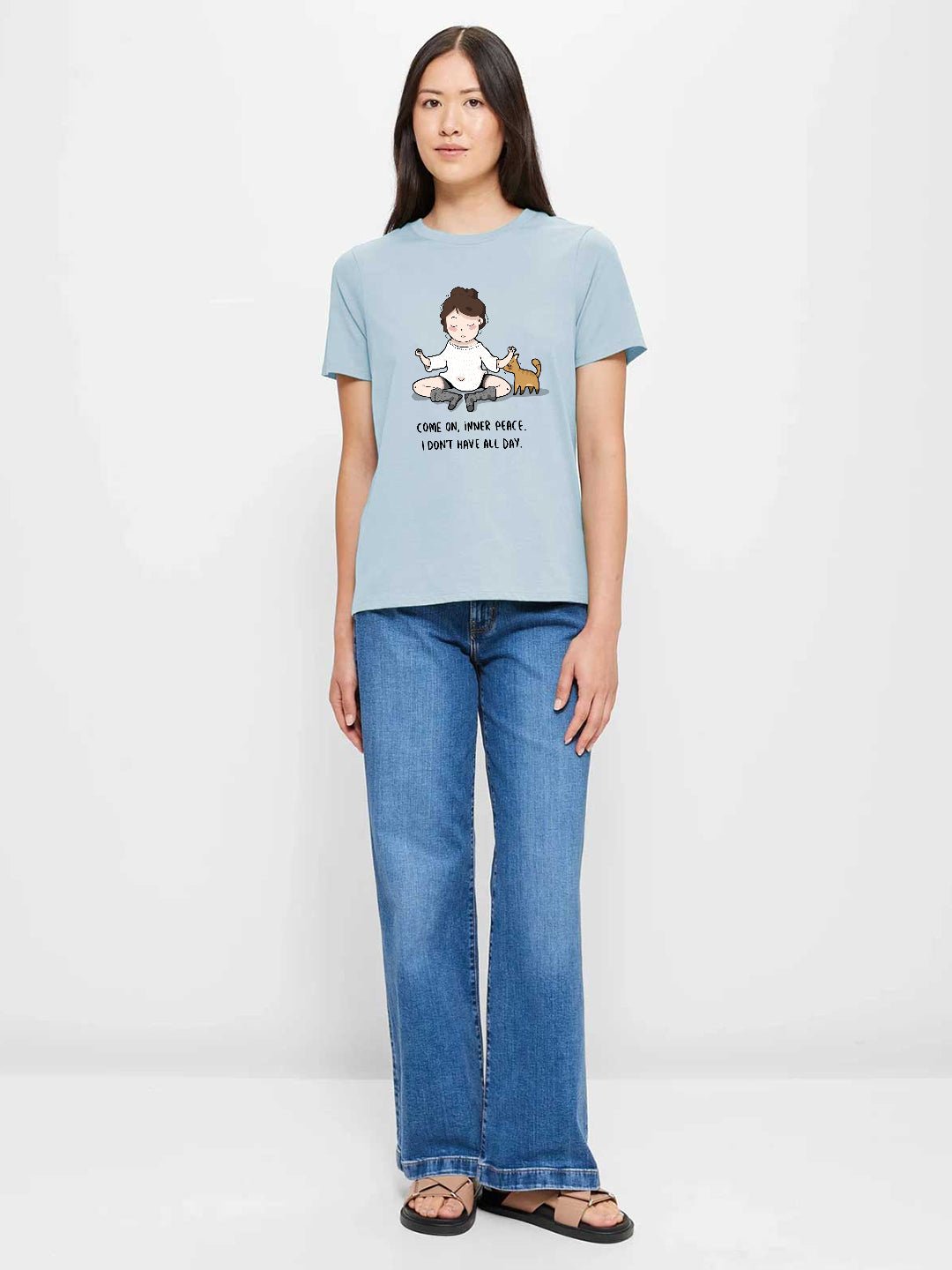 Upgrade your everyday style with this premium graphic T-shirt designed for comfort and a modern look. Made from cotton fabric. it’s perfect for casual wear all day long. Crew Neck Half Sleeves Regular Fit 180 GSM  Fabric: 100% Premium Cotton  Size: Model is wearing L size Country of Origin: Proudly Indian Washing Instructions: Machine wash. Do not iron directly or scrub on print. Dry on flat surface as hanging may cause measurement variations Color shown in the picture may vary from the actual product due to different lighting Product Description Buy sky color inner peace women half sleeve t-shirt online from PRONK, available in XS to XXL size. Choose from the wide collection. Free worldwide shipping!