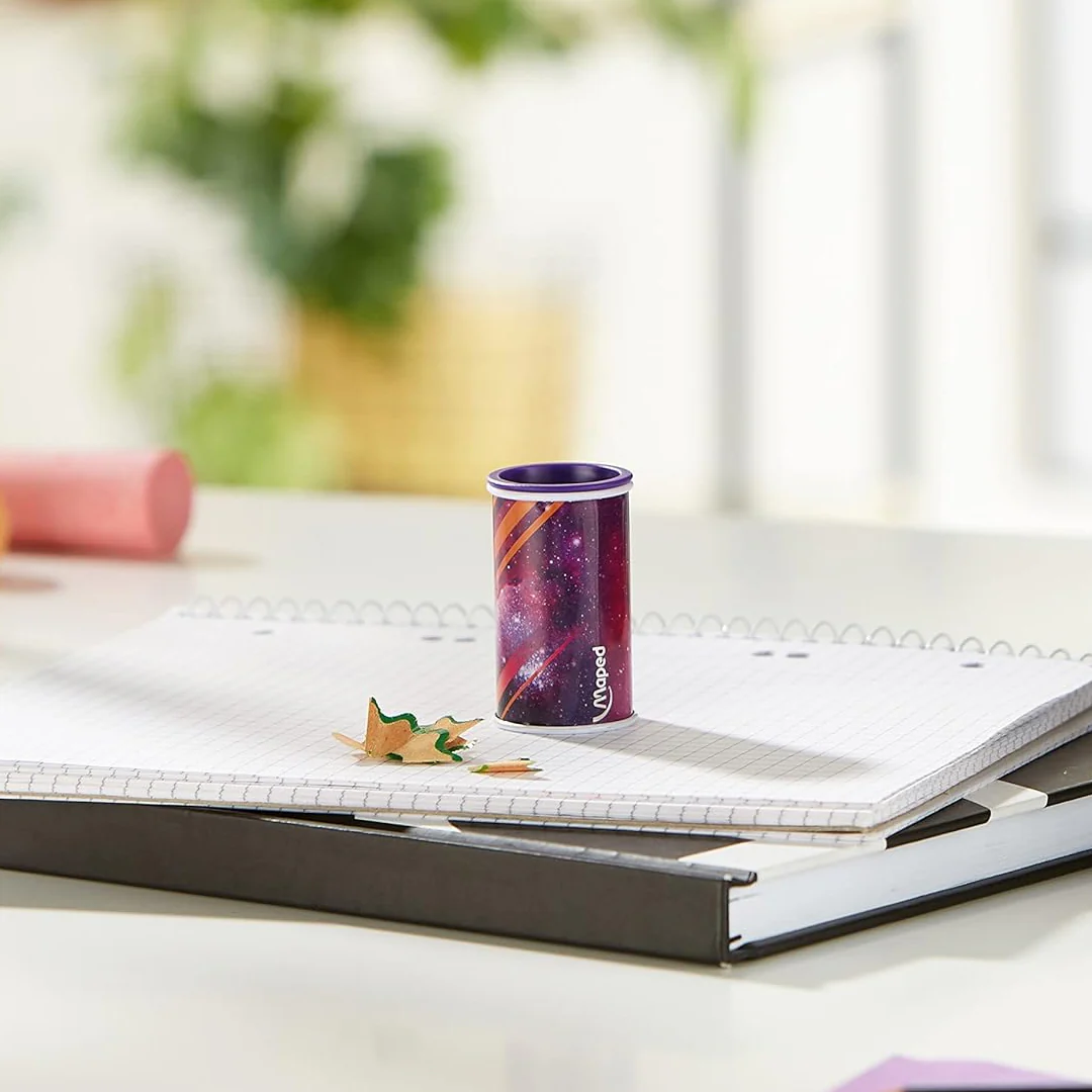 Not just a functional tool, the Maped Mini Cam Cosmic Pencil Sharpener stands out with its vibrant, cosmic-themed design. It adds a touch of personality to your stationery collection, making it a fun and attractive accessory for kids and adults alike.