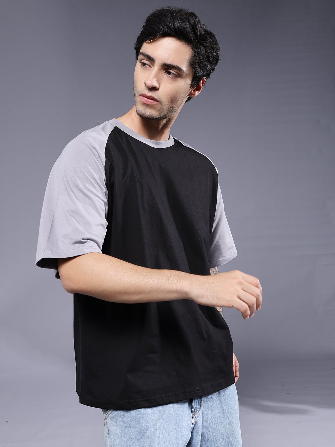 Product Description Men Oversized t-shirt with raglan sleeves and a relaxed fit for a trendy streetwear look. Crafted from soft and breathable fabric to keep you stylish and comfortable all day. Specifications Fit: Oversized Fit Pattern: Colorblock Material: 100% Cotton Neckline: Crew neck Sleeve Type: Half sleevesOccasion: Casual, streetwear Size: Model is wearing L size Country of Origin: Proudly Indian Washing Instructions: Machine wash cold, do not bleach Color shown in the picture may vary from the actual product due to different lighting