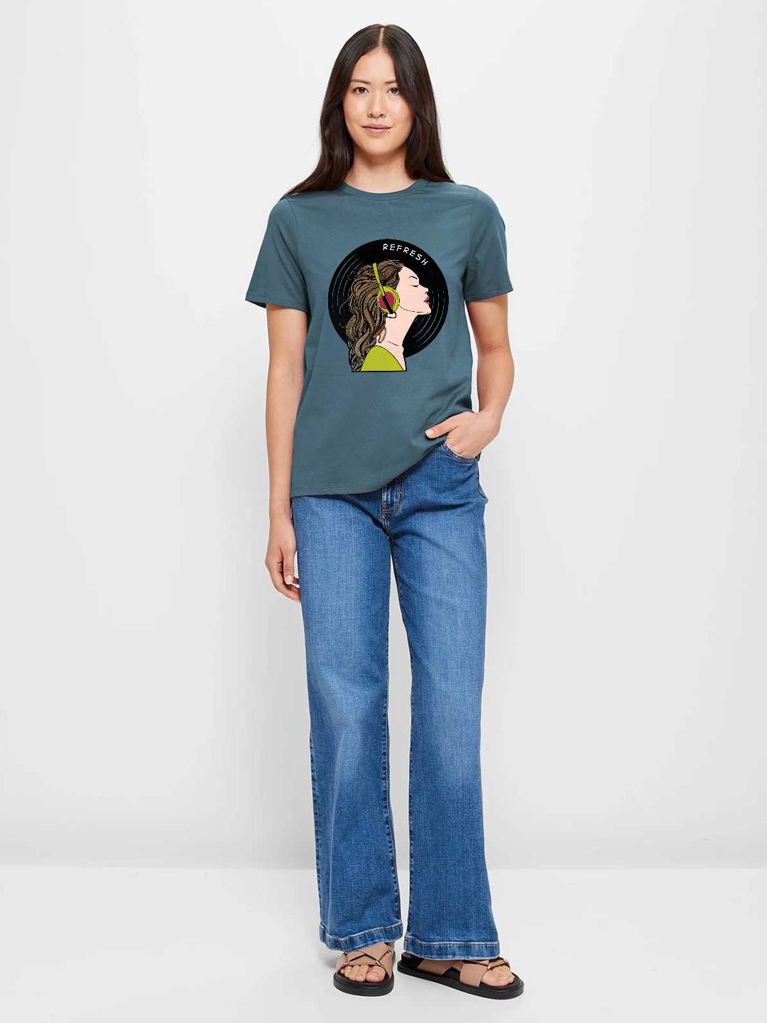 Upgrade your everyday style with this premium graphic T-shirt designed for comfort and a modern look. Made from cotton fabric. it’s perfect for casual wear all day long. Crew Neck Half Sleeves Regular Fit 180 GSM Fabric: 100% Premium Cotton Size: Model is wearing L size Country of Origin: Proudly Indian Washing Instructions: Machine wash. Do not iron directly or scrub on print. Dry on flat surface as hanging may cause measurement variations Color shown in the picture may vary from the actual product due to different lighting Product Description Elevate your casual style with teal blue color refreshing women half sleeve t-shirt. Buy online from PRONK, Available in XS to XXL size. Free worldwide shipping!