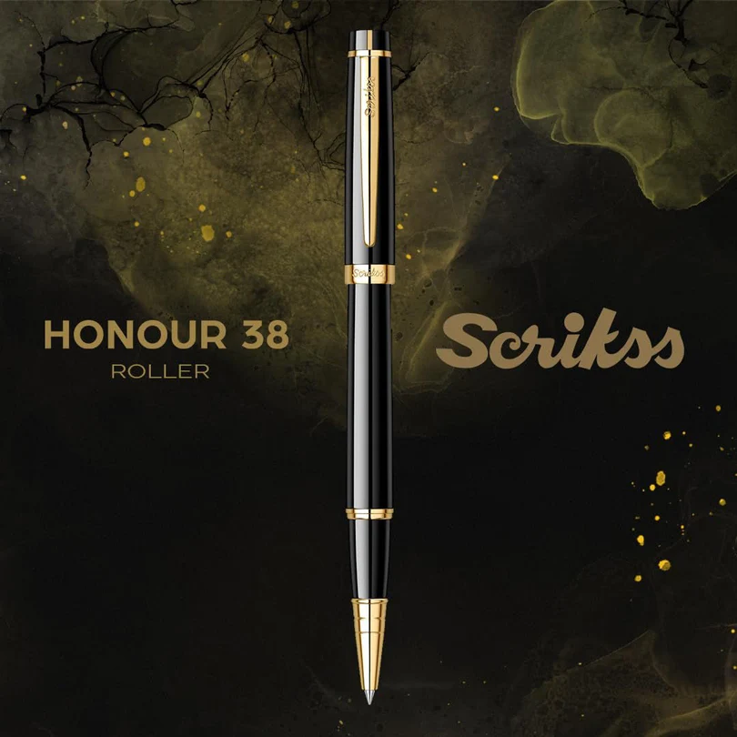 - The Scrikss Honour 38 Glossy Black Roller Ball Pen is a luxurious writing instrument crafted for those who appreciate fine detailing and superior performance.