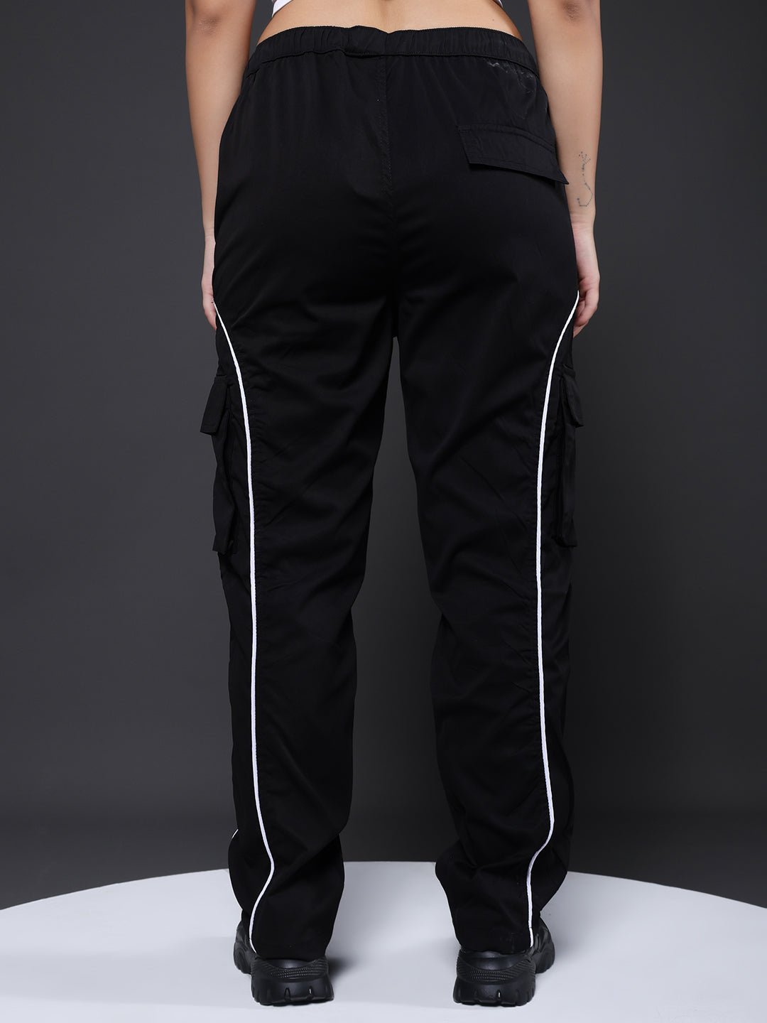 Product Description Women’s relaxed-fit black cargo joggers featuring contrast side stripes, multiple pockets and an adjustable drawstring waist for everyday comfort and style. Specifications Fit: Relaxed Fit Pattern: Solid with Side Stripes Material: Poly Twill Waistband: Elasticated with Drawstring Pockets: 4 front pockets, 2 back pockets Size: Model is wearing L size Country of Origin: Proudly Indian Washing Instructions: Machine wash. Color shown in the picture may vary from the actual product due to different lighting